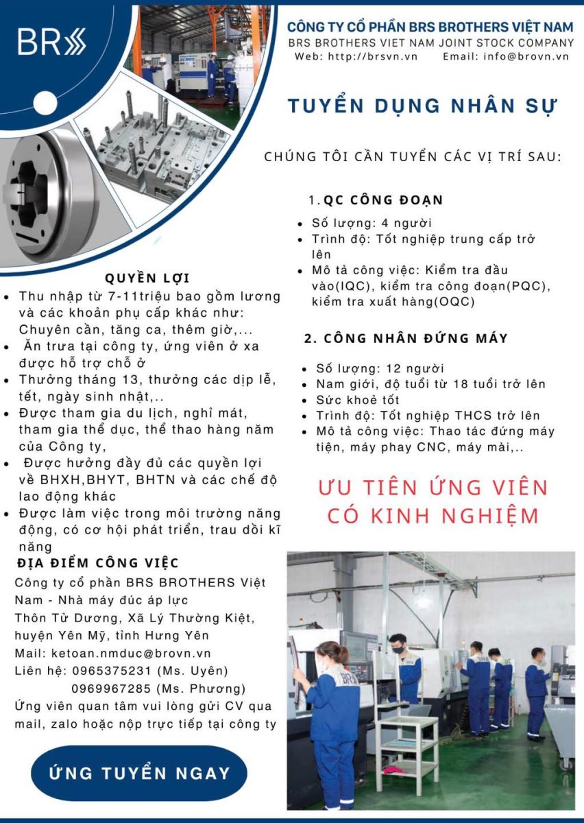 Công ty cổ phần BRS Brothers Việt Nam cần tuyển dụng các vị trí: